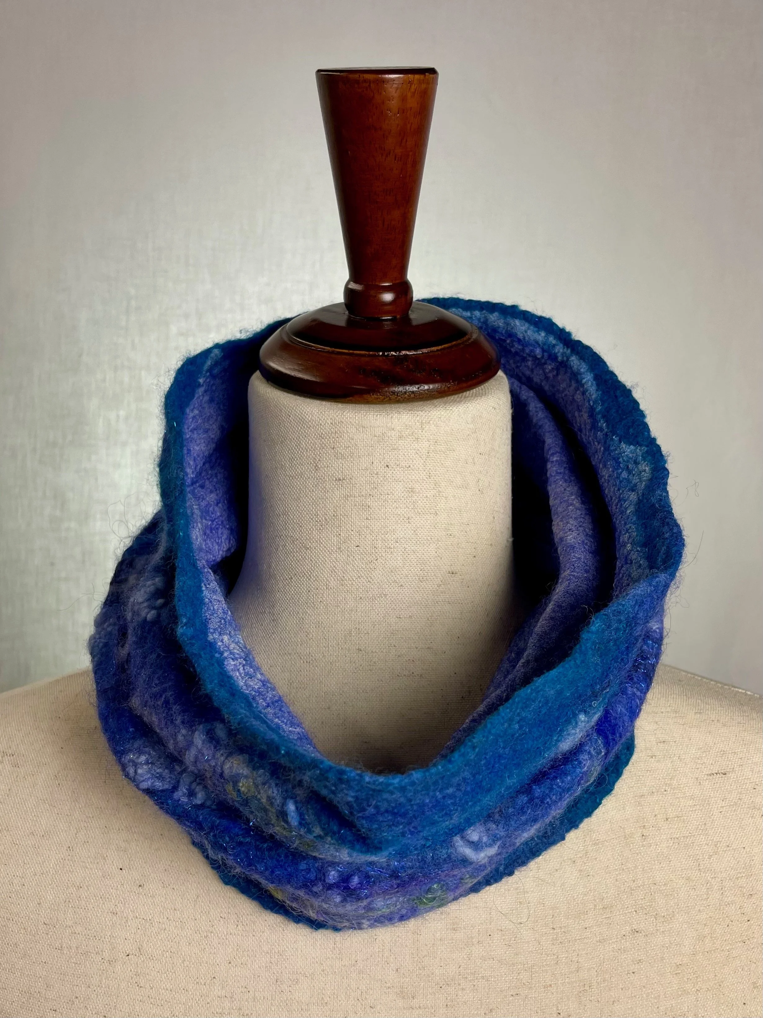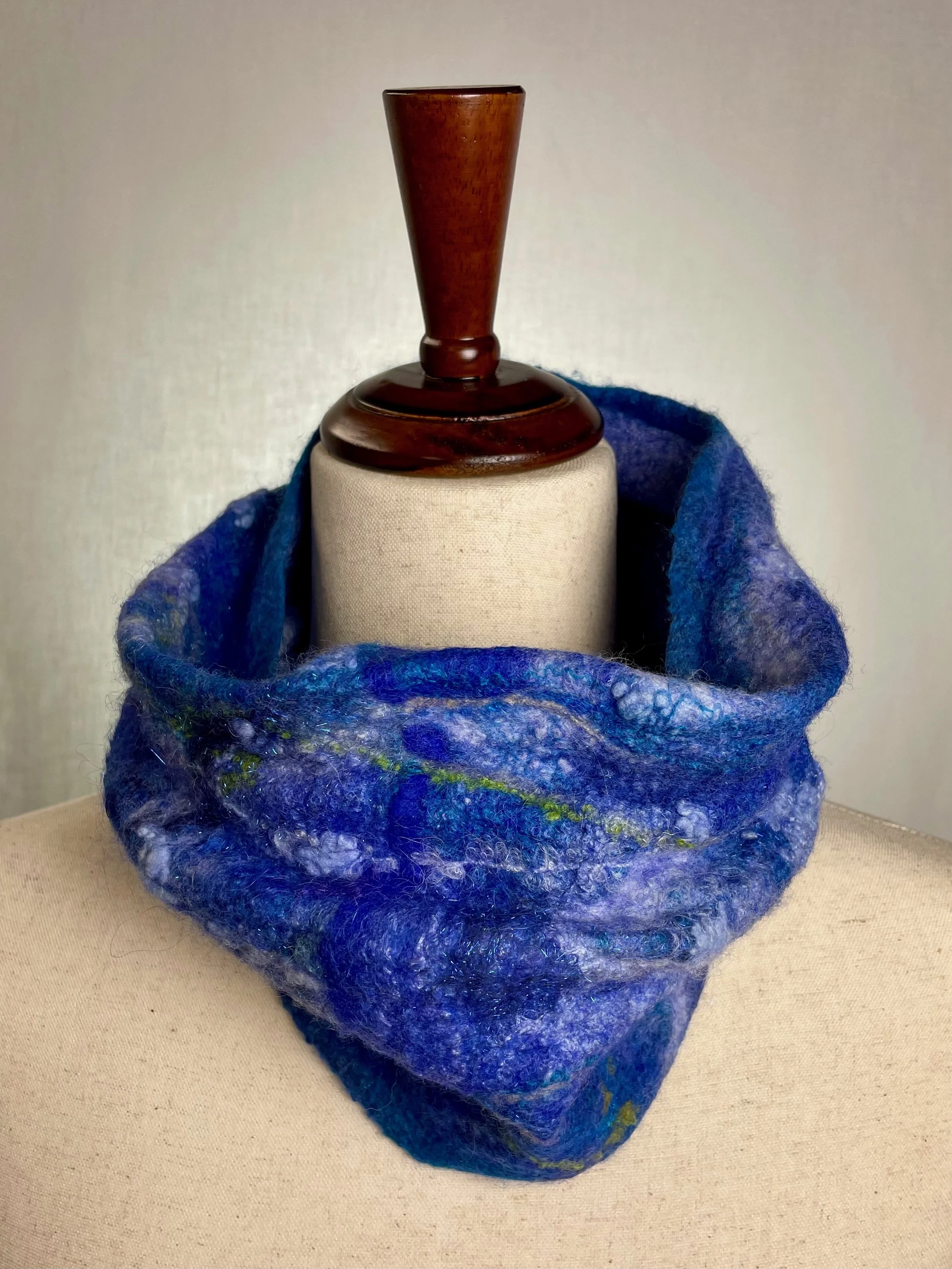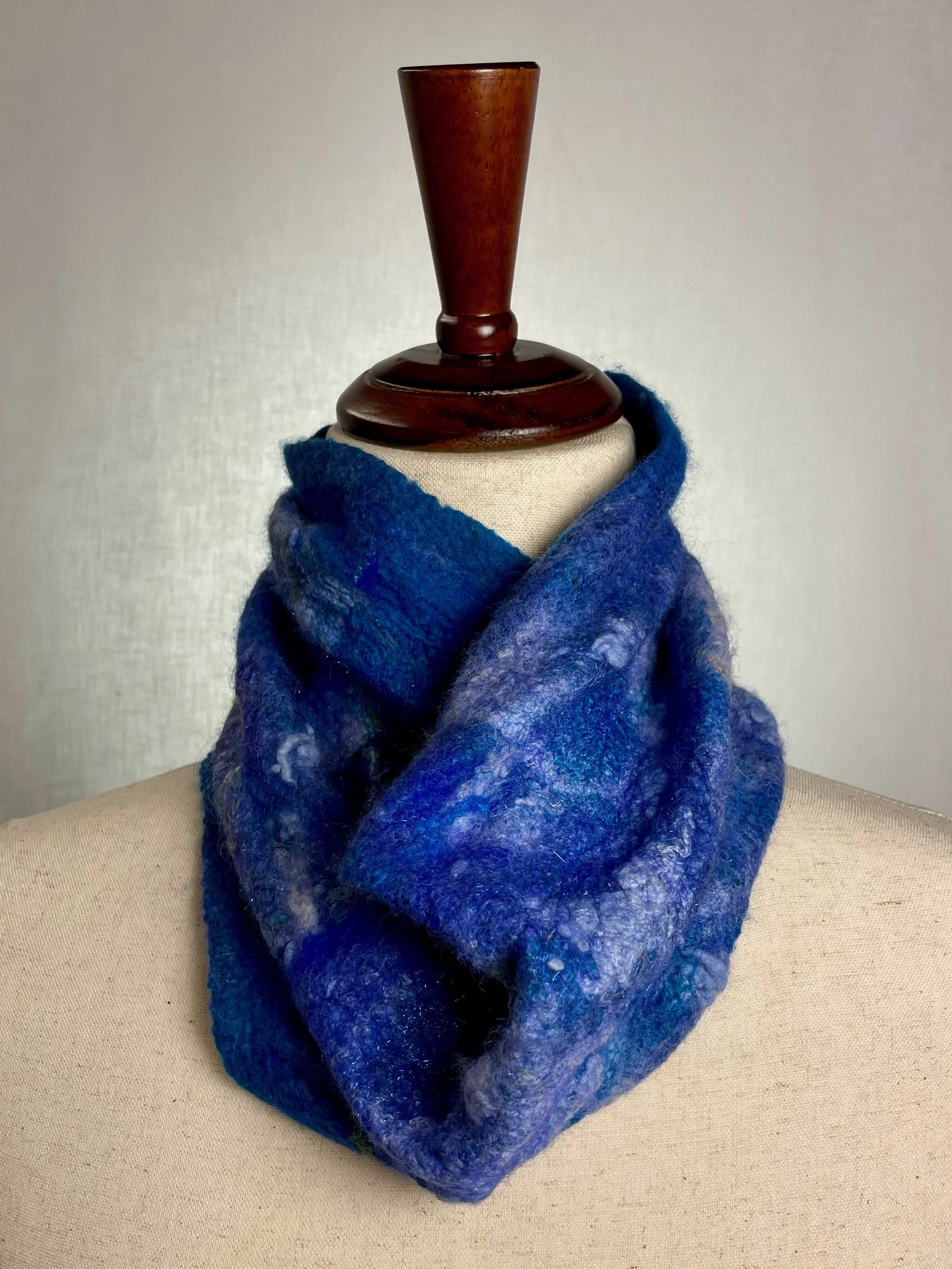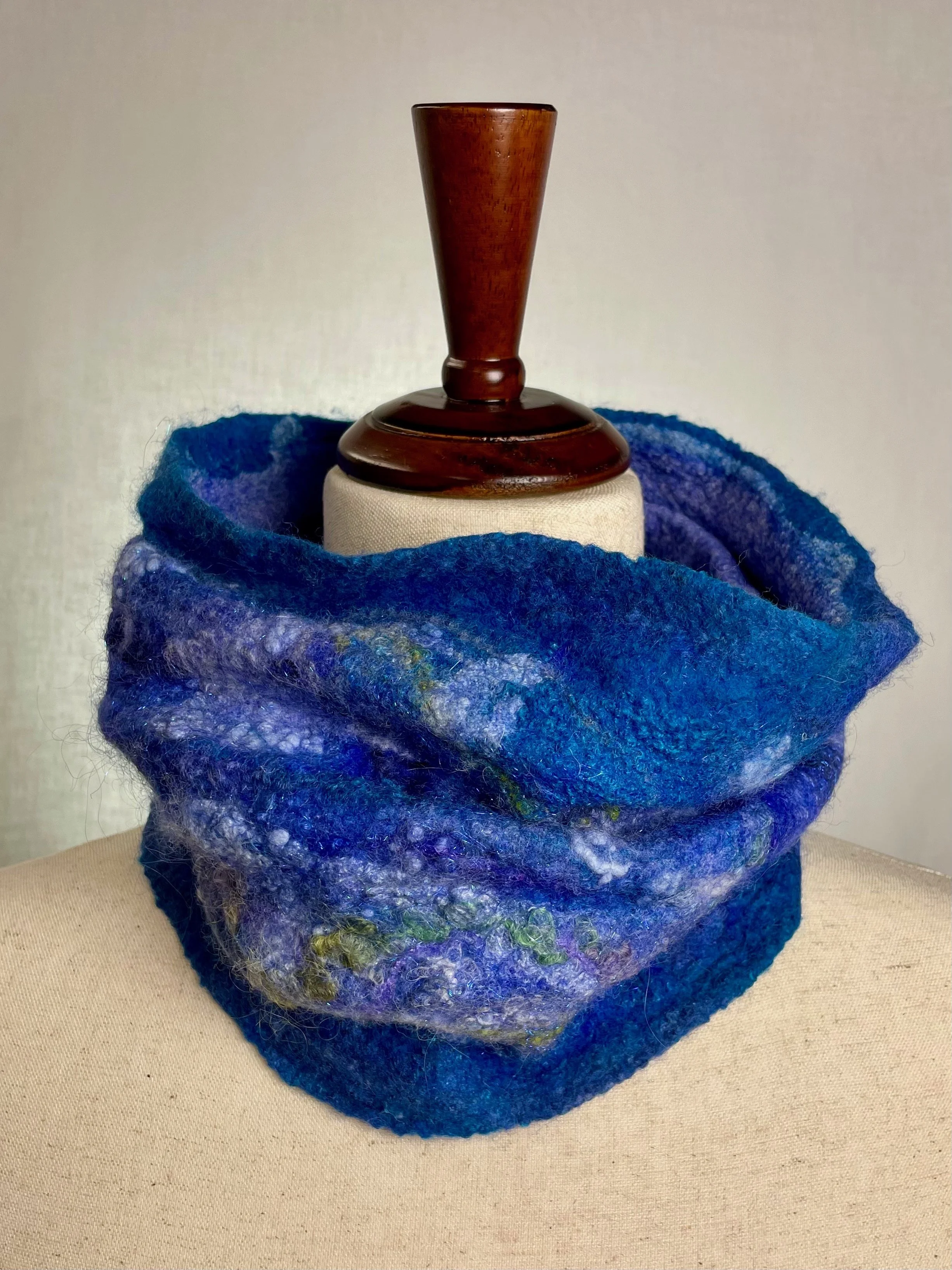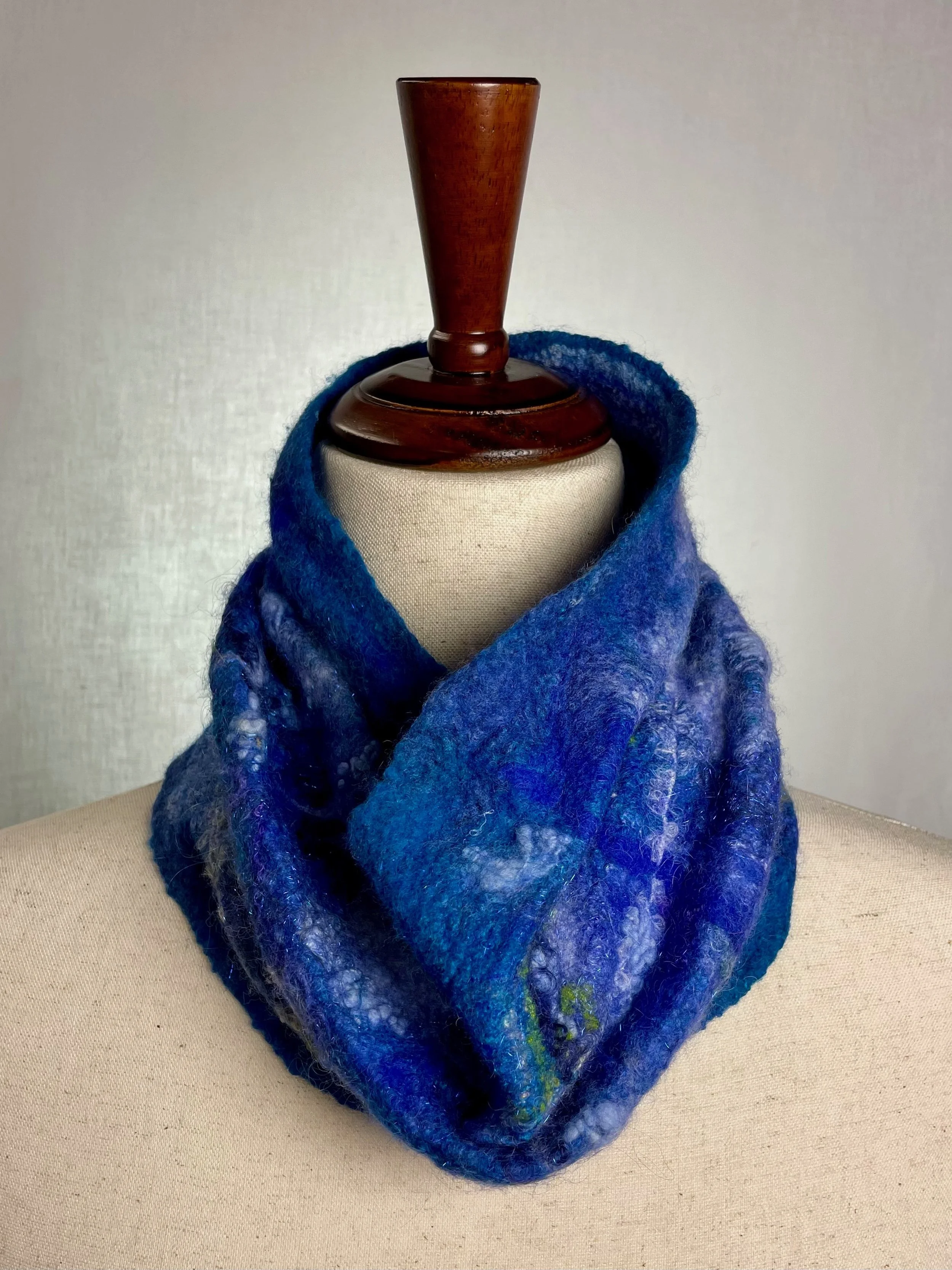 Summer Sound Cowl Inspired by Long Island’s North Shore, this cowl captures the Caribbean-blue hues and tranquil vibes of an idyllic summer beach day. Merino wool, iridescent Angelina fiber, art yarn, and silk over Margilan silk.